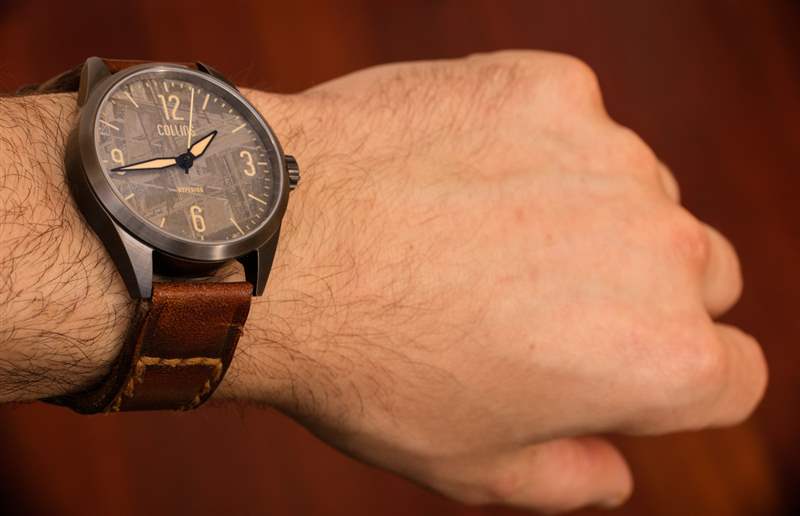 附在表殼上的是一條 Gunny Caitlin 8 型號仿舊棕色皮革表帶。它使用了 Collin 簽名的搭扣,整體看起來不錯,做舊。也就是說,如果我要更經常地佩戴這款手表,我要做的第一件事就是更換表帶。一方面,我不怎么穿棕色,所以我會考慮用青銅色或灰色表帶代替棕色。更重要的是,Gunny 表帶很舒服,但我從來都不喜歡看起來“過于手工制作”的表帶。說到表帶,我喜歡一切都是“機器完美”,我不像其他人那樣喜歡“有機外觀”。表帶寬 20 毫米,如果您更喜歡備用表帶以外的其他表帶,更換 Collins Hyperion Meteorite 上的表帶是一件非常簡單的事情,只要您有東西可以替換它。