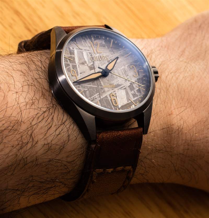 在任何時候,表盤上的指針都清晰易讀,但根據光線的不同,隕石表盤上的時標和其他印刷則不清晰。這對我來說沒什么大不了的,但是那些喜歡在所有光線條件下一直看到時標的人應該考慮一下表盤上的奶油色流明印花有時如何與表盤的外觀融為一體. 所有最初的 Hyperion 手表的時標設計都是相同的,因此對于稍微傳統易讀的表盤,您可以選擇柯林斯提供的其他產品。對我來說,Hyperion Meteorite 是柯林斯手表公司首次亮相的產品中最有趣的,它融合了熟悉的外觀、裝飾性但陽剛的表盤以及與我家鄉的愉快情感聯系。