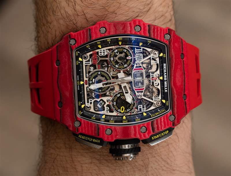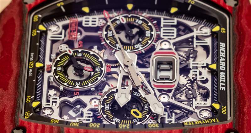 Richard Mille RMAC3 自動飛返計時機芯以 4Hz 運行,兩個發條盒之間的動力儲存約為 50 小時。自動轉子還采用了 Richard Mille 的可變幾何技術,雖然很少使用,但很有趣。它允許制表師(而不是佩戴者)根據佩戴者手腕的活躍程度來改變轉子的旋轉幾何形狀,以使其或多或少容易旋轉。從理論上講,使用此功能可以幫助某人讓手表足夠上鏈,但又不會太上鏈。我還沒有遇到任何人仔細研究過自己的佩戴方式,并讓 Richard Mille 為他們的“手腕習慣”單獨設置轉子幾何形狀。