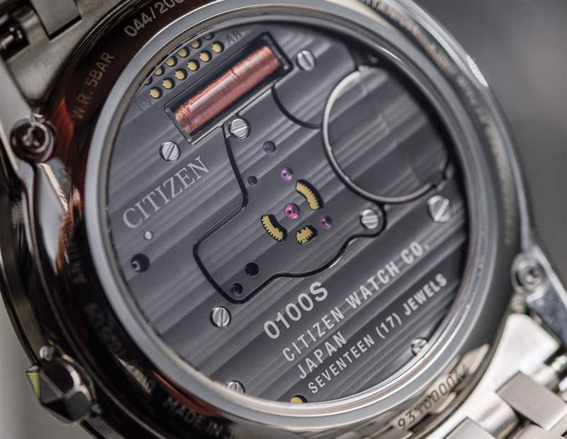 Calibre 0100 還包括一個熱補償系統。同樣,這項技術并不新鮮,但應用于 Calibre 0100 時,它是多項功能之一,綜合起來有助于達到每年一秒的精度。石英機芯中的熱補償系統包括一個小型內部溫度計,每分鐘測量石英晶體腔室的溫度。該信息用于對運動產生的速率進行調整,從而補償由溫度變化引起的已知誤差。當溫度變化時,機芯如何知道補償速率結果的多少?簡單:在組裝機芯之前,西鐵城會準確測量特定石英晶體在一系列溫度下的表現,然后將特定信息包含在機芯中。這些都不等同于標準石英機芯的操作更簡單,技術難度更低。您可以看到,雖然 Calibre 0100 確實是石英機芯,但它的構造和性能都不像任何人都可以在其他地方大量找到的標準石英機芯。