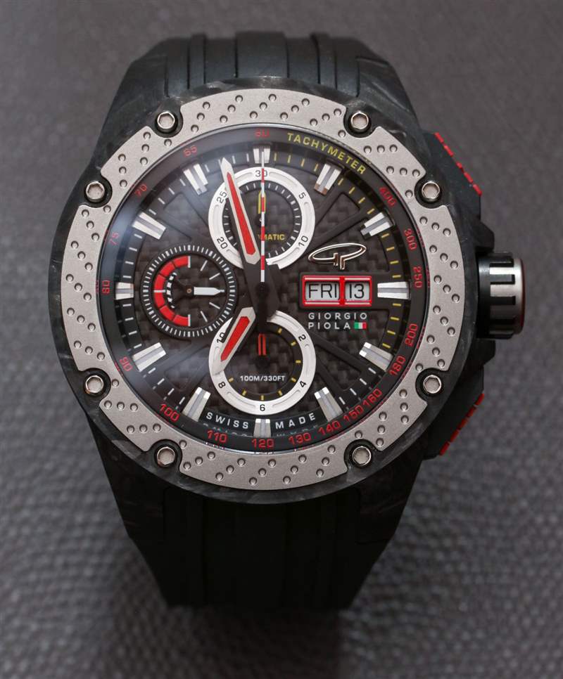 喬治·皮奧拉 (Giorgio Piola) 是一級方程式世界的顏色和材料以及賽車儀表和儀表板如何最佳運作方面的專家。我感到一種真正的感覺,即關心和研究表盤的顏色和材料如何協同工作,不僅喚起 F1 的主題外觀,而且提高易讀性。表盤首先給我留下了深刻的印象,它只有啞光表面和平坦的 AR 涂層藍寶石水晶,不會真正產生眩光。實際上,唯一的半閃亮元素是應用的時標和計時環。唯一真正閃亮的元素是小 Giorgio Piola 標志 – 相比之下,它讓您意識到表盤上沒有其他東西是反光的。