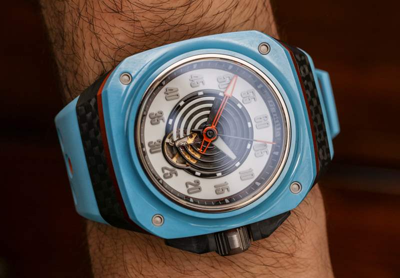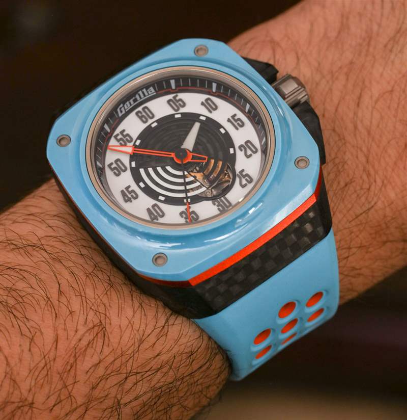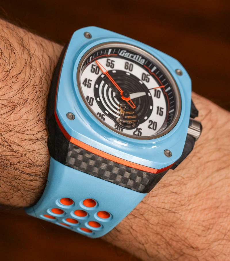 Fastback GT Mirage 表殼呈方形,寬 44 毫米(表冠寬 48.5 毫米),防水深度達 100 米。由于表殼形狀和寬肩帶,它穿得很大——但這就是 Gorilla 想要的外觀。我會爭辯說,盡管尺寸很大,但手表佩戴起來很舒服。對于 Mirage 版本的手表,Gorilla 繼續采用鍛造碳表殼,在此型號上,表耳結構附近有一些碳纖維紋理(一個容易錯過的細節)。該表殼還使用鋼、鈦、陽極氧化鋁作為表圈下方的橙色環,以及用于表圈本身的陶瓷。這是我見過的少數幾款使用“粉藍色”陶瓷部件的手表之一——如今這仍然不常見。表盤上方是 AR 涂層藍寶石水晶。廣告訊息廣告信息結束