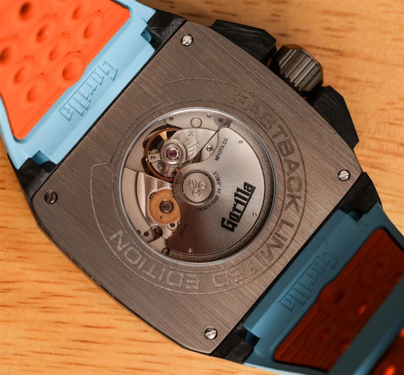 對于 Fastback GT Mirage,Gorilla 做了一些不同的事情,除了改變現有 Fackback 系列的顏色(沒有“GT”)。與 Fastback 相比,這款 Fastback GT Mirage 的主要區別在于升級的機芯(除了顏色)。Miyota 不再是 8XXX 系列日本 Miyota 機芯,而是來自 Miyota 9XXX 系列,在這種情況下是 Miyota 90S5 機芯。這款自動機芯以 4 赫茲的頻率運行,具有 48 小時的動力儲存,并且通過手表的表盤可以看到外露的擒縱機構。90S5在性能和外觀上都是升級版。您可以通過表殼背面的水晶窗看到機芯的其余部分。