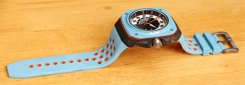 海灣石油/賽車藍和橙色主題的大部分體現在雙色橡膠表帶上,表帶外側為藍色,內側為橙色。橙色可以通過表帶上的穿孔識別出來,我認為大猩猩在設計如何使用顏色方面做得很好。連接到表帶的是一個鈦扣。