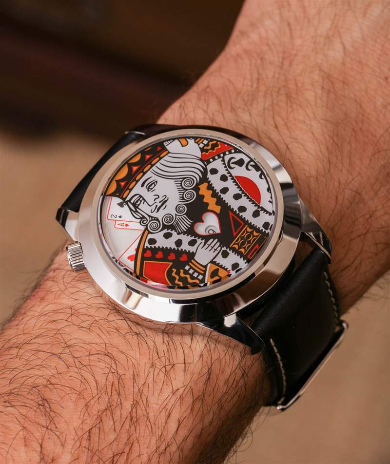 雖然 King XL 的技術元素滿足了我作為手表愛好者的需求,但這種類型的時計并不是要給其他手表書呆子留下深刻印象。這是一款時尚手表,當您認為在身上佩戴撲克牌 King 角色會增加您想要傳達的風格信息時。表盤顯然不是最清晰的,小時指示器的心形窗口都在較小的一側,考慮到表盤的深度,很難從某個角度閱讀。所以這意味著要輕松閱讀這個表盤,你需要直接看它。您也無法真正將時間精確到分鐘。分鐘指示器盤有六個指示器——一個小時內的十分鐘段中的每一個。Ace 牌用來表示“10”,而其他數字牌則用來表示十分鐘的各個部分。您可以以 2-4 分鐘的精度讀取時間。用我們的手機,考慮到這款手表是為了好玩——我可以原諒這一點,我只想知道這不是一款運動手表,也不是我想經常看手表時戴的手表為了告訴時間。我認為 King XL 在社會吸引力方面彌補了它缺乏易讀性的原因。