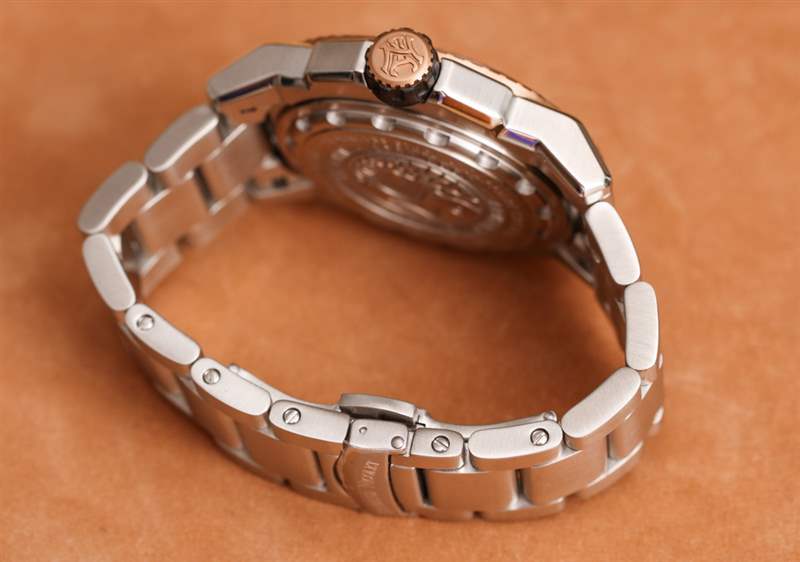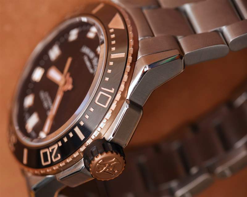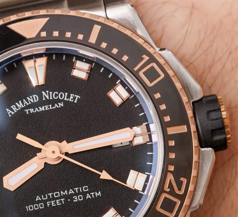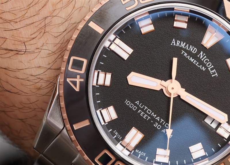 表盤周圍是我上面提到的傾斜旋轉(zhuǎn)潛水表圈。表圈嵌件材料采用拋光黑色陶瓷,表圈上的機切數(shù)字根據(jù)JS9的版本涂有不同的顏色。除了這種玫瑰金色油漆外,其他版本還使用了白色/銀色。JS9 的表盤顏色目前為白色、黑色和藍(lán)色。Armand Nicolet 似乎真的很喜歡玫瑰金外觀,因為 2018 年可用的 JS9 型號中有一半以上采用這種顏色。一些最有趣的與審查版本相似,但帶有白色表盤。“經(jīng)典” JS9 潛水表型號可能是帶有銀色/白色文字/標(biāo)記和藍(lán)色或黑色表盤的型號。