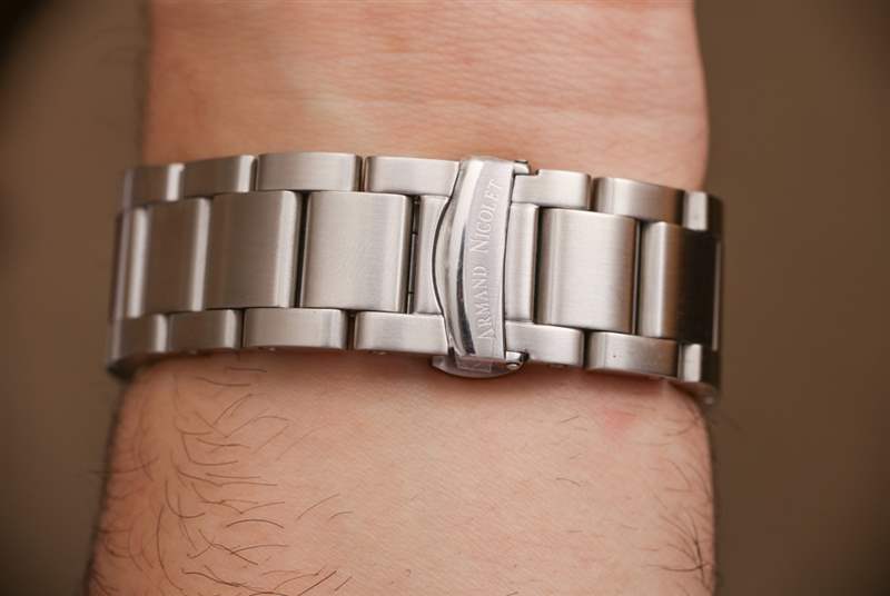 手表愛好者會注意到表耳設(shè)計令人想起愛彼皇家橡樹或宇舶 Big Bang。這種設(shè)計使表鏈和表耳的末端在視覺上融合在一起,形成了一個堅固的結(jié)構(gòu)。現(xiàn)在,橡膠表帶不像漂亮的金屬手鏈那樣“花哨”,但它們對于實際運動目的更有意義。Armand Nicolet 要求您在手鏈或橡膠表帶之間進(jìn)行選擇,而無需同時提供它們。我本來希望手鐲上的 JS9 手表版本還包括一條橡膠表帶。我很確定消費者愿意為此支付適度的溢價。