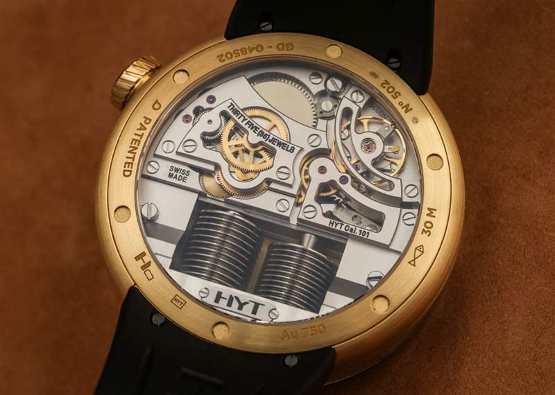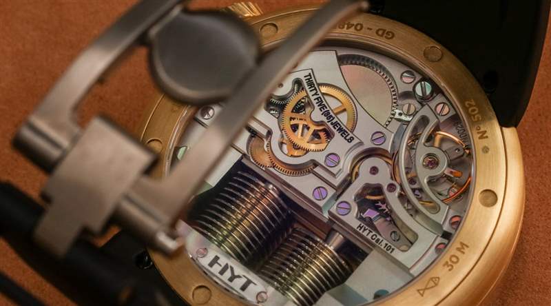 在“液壓機械”時標(biāo)指示器中與淺金色配對的是黑色液體(或在另一個 2N 金型號中為紅色)。藍寶石水晶“毛細(xì)管”管后面是一個發(fā)光條,它在黑暗中發(fā)光,有助于在光線不足的情況下閱讀手表。HYT 的 101 型手動上鏈機芯為 H0 提供動力,就像它為 H1 提供動力一樣。HYT 為機芯中的螺絲帽著色,當(dāng)機芯表面在光線的作用下反射出紫色陰影——這是我以前在 H0 手表中從未見過的。機芯以 4 赫茲運行,動力儲存 65 小時,分針和秒針顯示在單獨的表盤上,動力儲存指示器位于輔助秒針盤對面。廣告訊息廣告信息結(jié)束